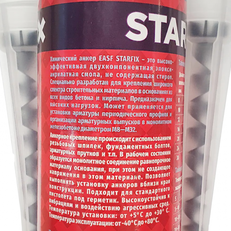 Анкер химический Starfix EASF 300 мл — высокопрочный химический анкер starfix easf 300 мл для надежной фиксации крепежа в бетоне и кирпиче. Обеспечивает долговечное соединение без распирающего эффекта. Подходит для установки заборов и металлоконструкций.